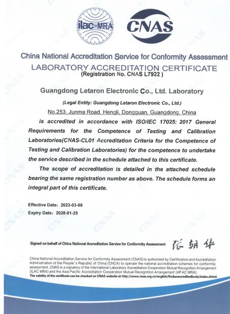 لقد بنت Letaron مركز أبحاث تكنولوجيا عالية الجودة، وأنشأت علاقات تعاونية مستقرة مع هيئات شهادة مرموقة في الداخل والخارج،والتي يمكن أن توفر خدمات الاختبار والشهادة من نقطة واحدة للشركات في المرحلة السابقة والمتابعةفي عام 2021 ، تم تقييمها على أنها منصة خدمة موقف واحد للبنية التحتية الوطنية للجودة (NQI) من قبل وزارة الصناعة وتكنولوجيا المعلومات.لقد أصبحت ميزة تنافسية فريدة من نوعها لـ (ليترون).